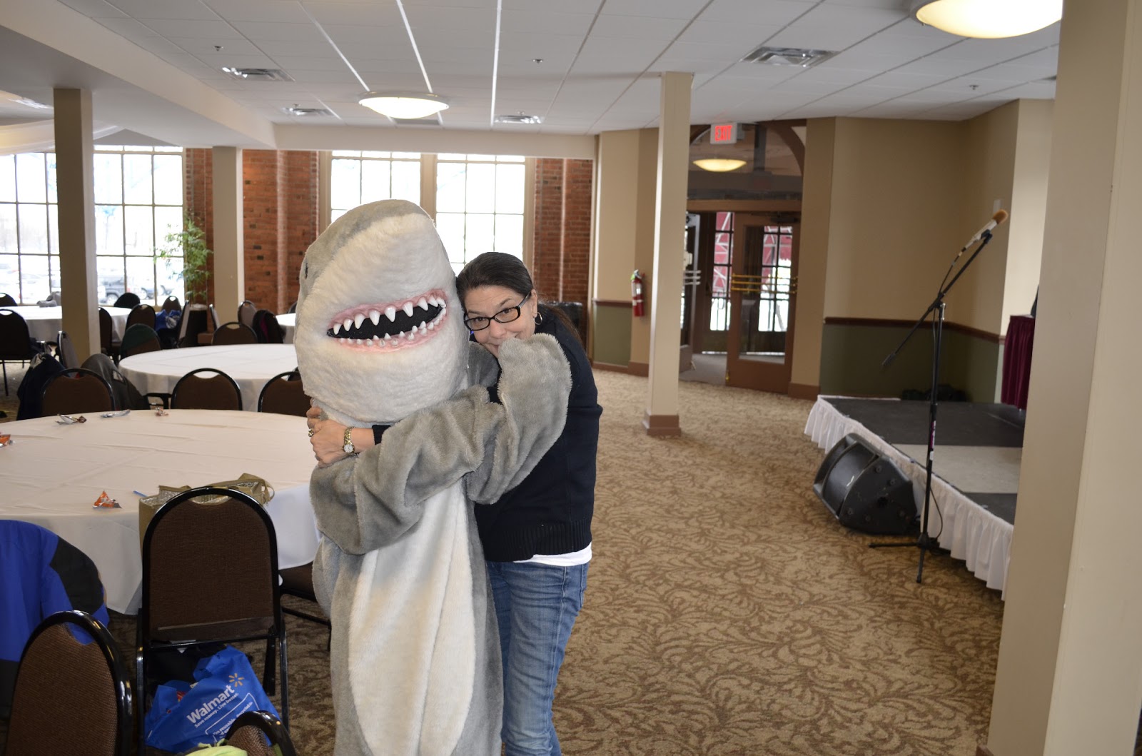 | Mardele Cohen and Greater Cleveland Aquarium’s shark mascot Sandy. Sandy’s the one on the left. |