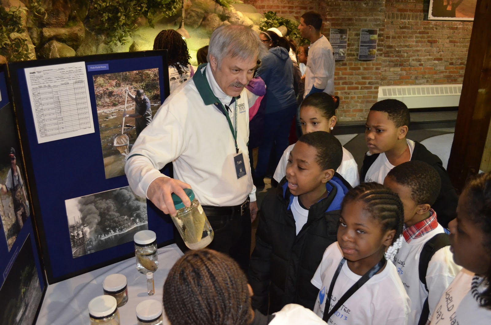 | Tom Zablotny shows students what kinds of fish we find in the Cuyahoga River and Lake Erie. Some kids were more impressed than others. |